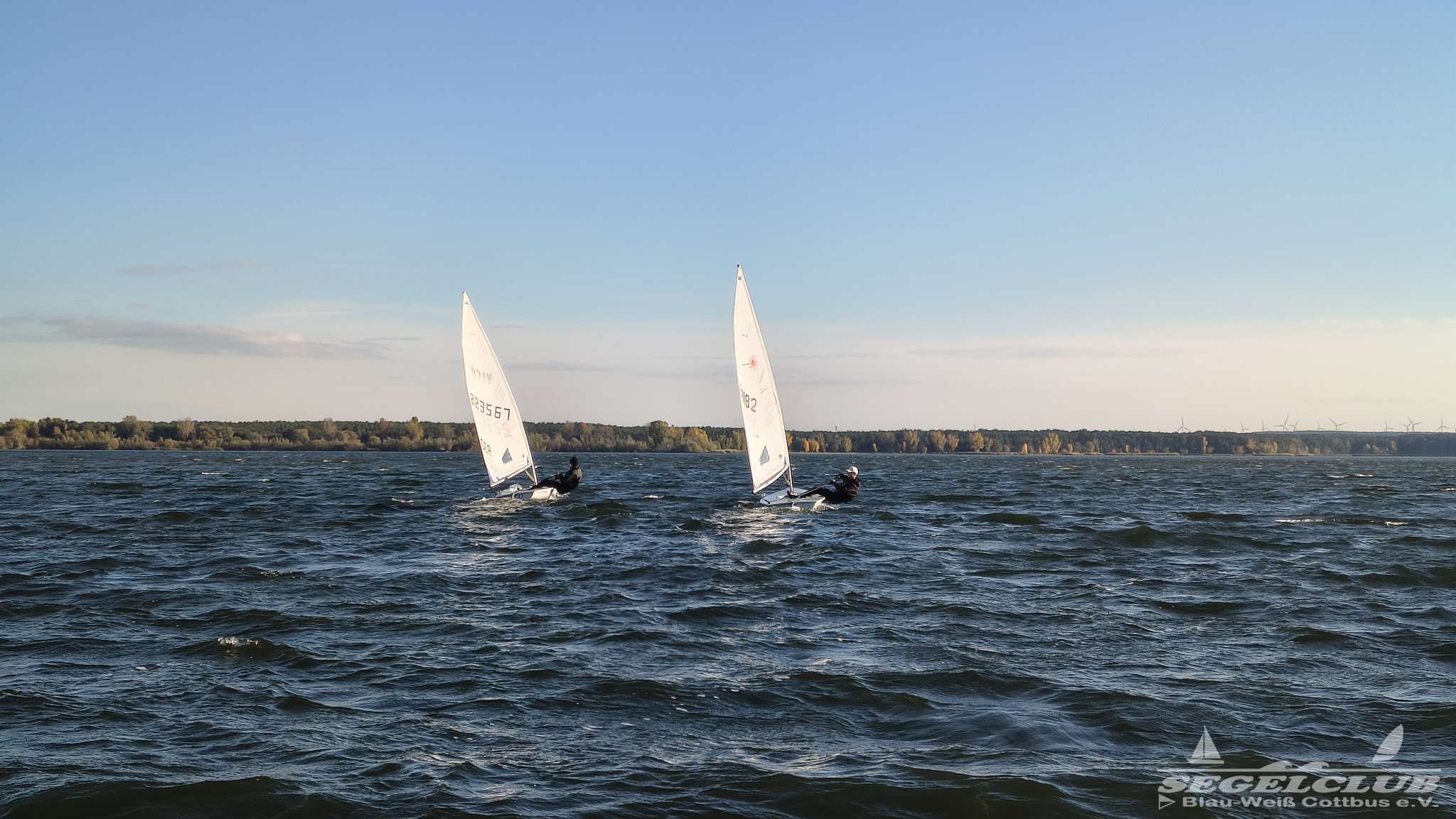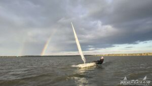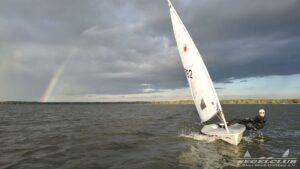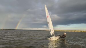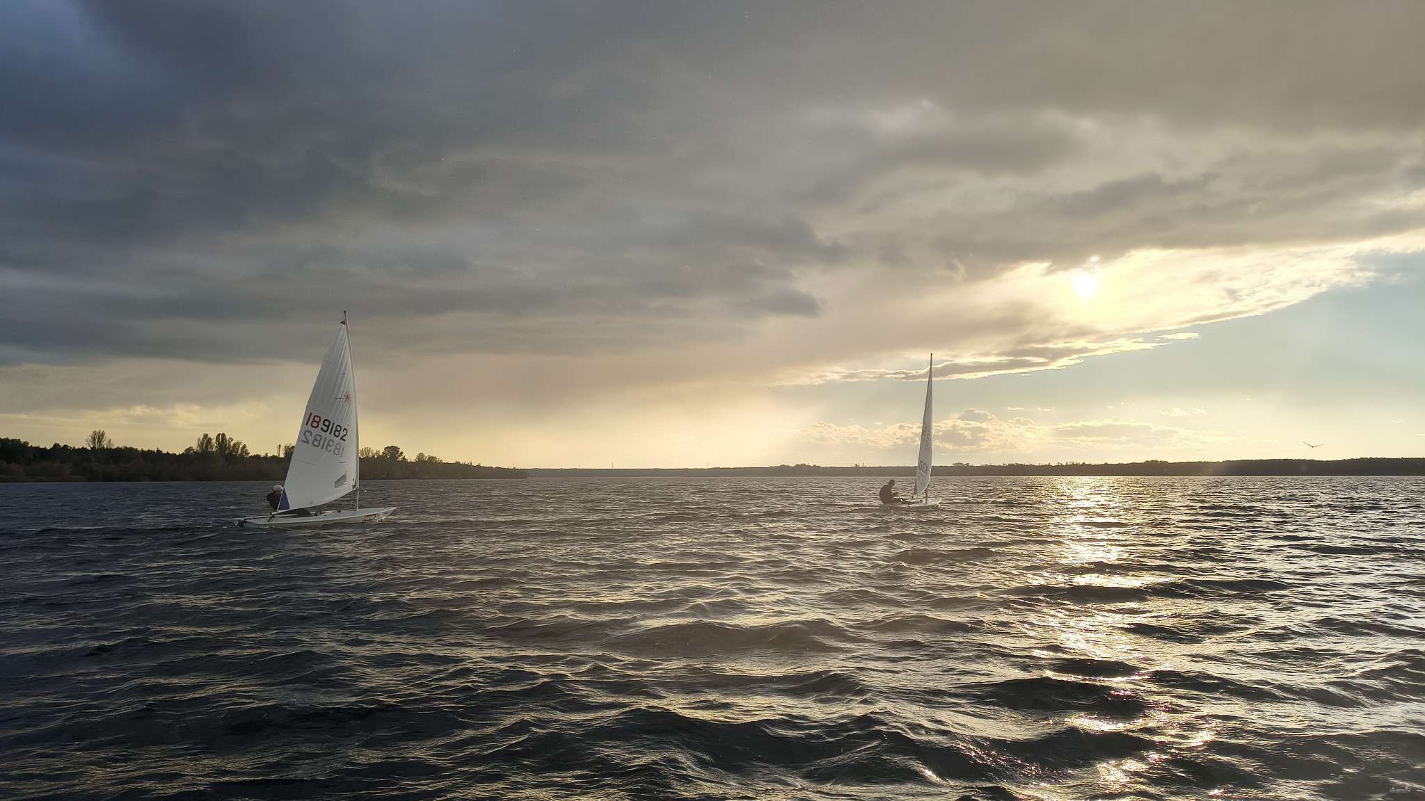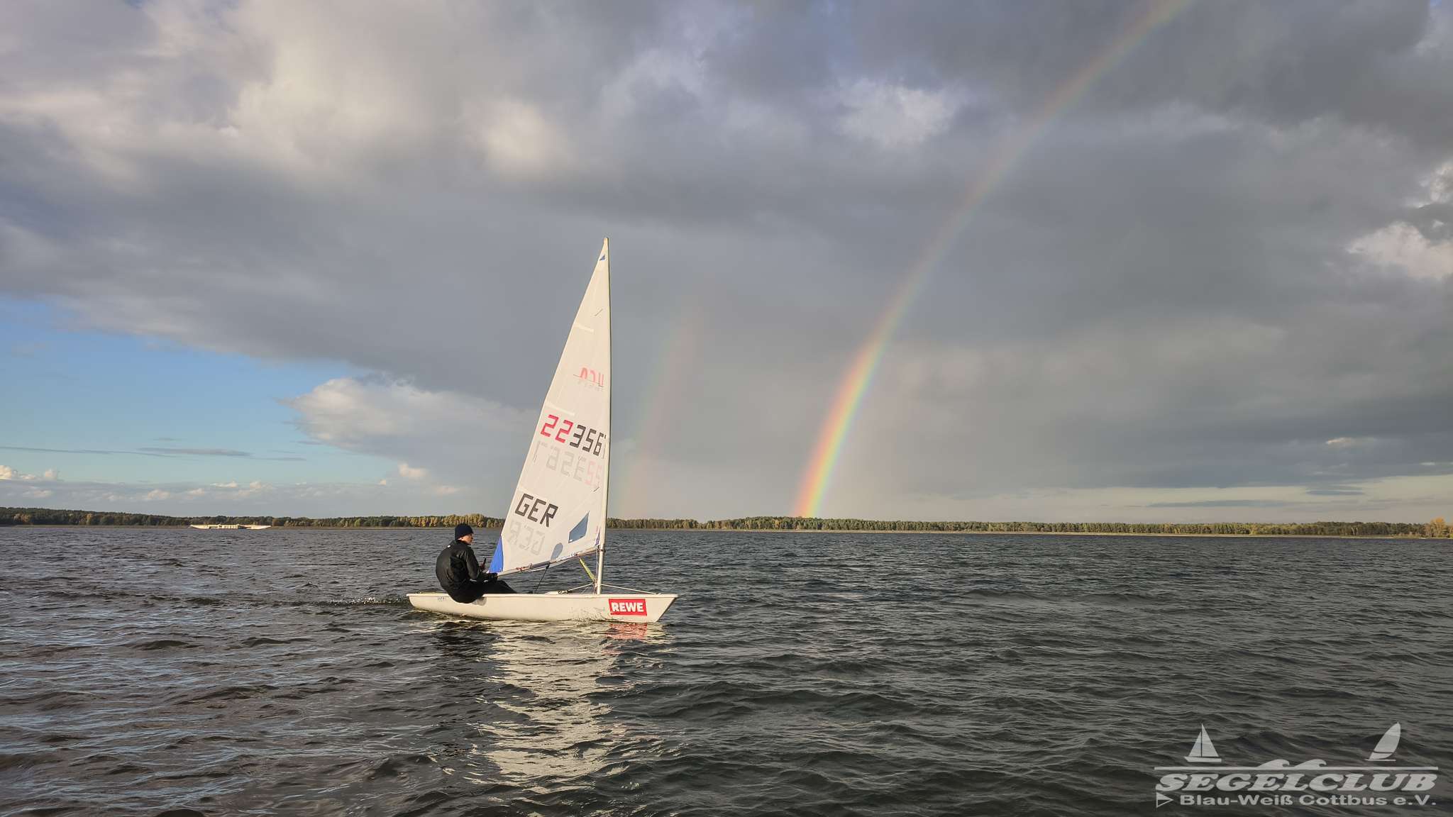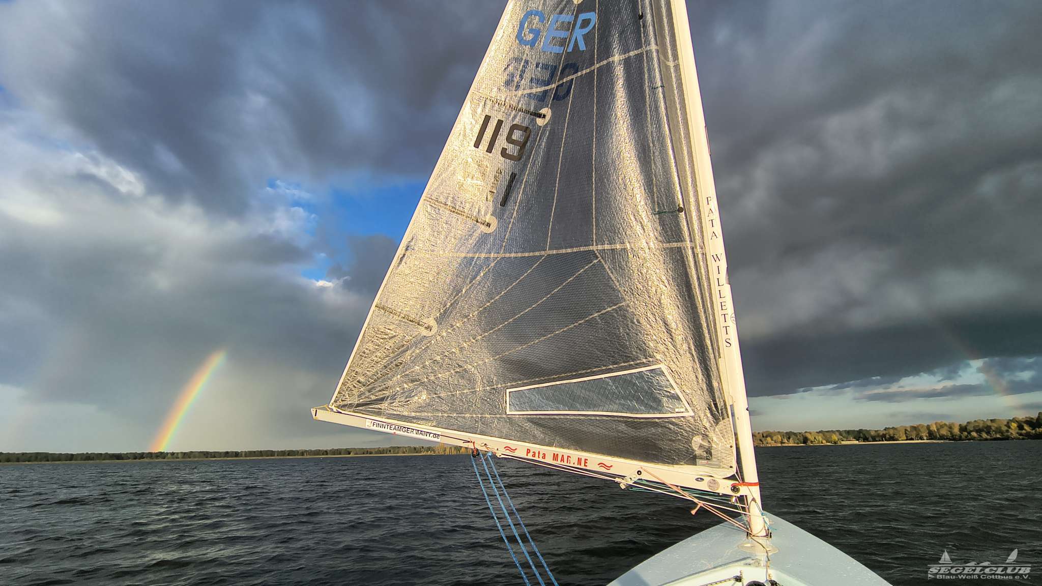 Der Höhepunkt folgte etwas später. Unter der dunklen Gewitterwolke brachen seitlich plötzlich Sonnenstrahlen durch – und spannten einen vollständigen Regenbogen über den See. Ja, viele von euch haben an diesem Abend in Cottbus und Umgebung ihren ganz eigenen Regenbogen gesehen, und gefühlt hatte jeder zweite genau dieses Bild im WhatsApp-Status. Wir waren mittendrin – beim Segeln direkt darunter.