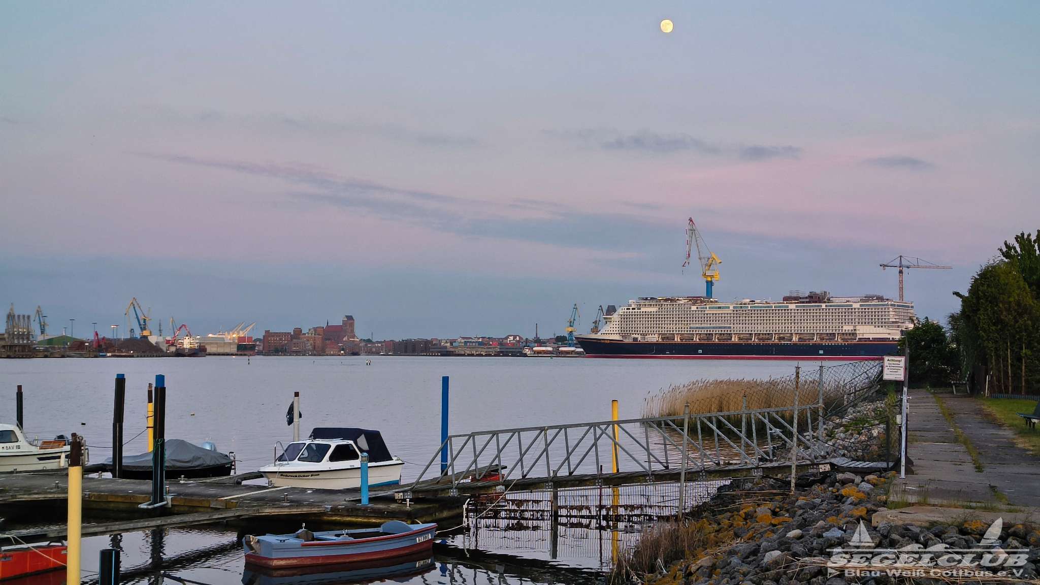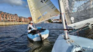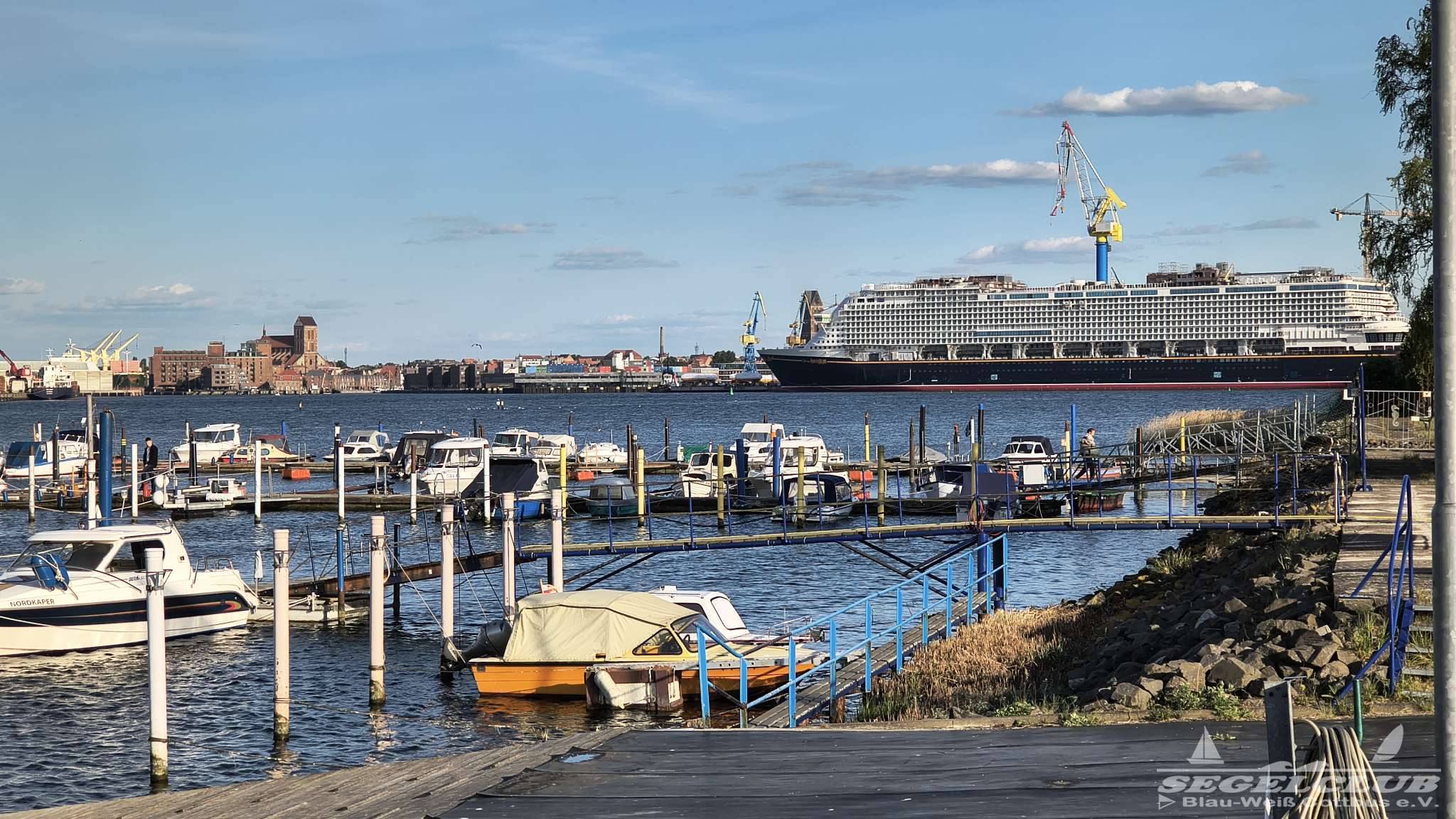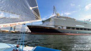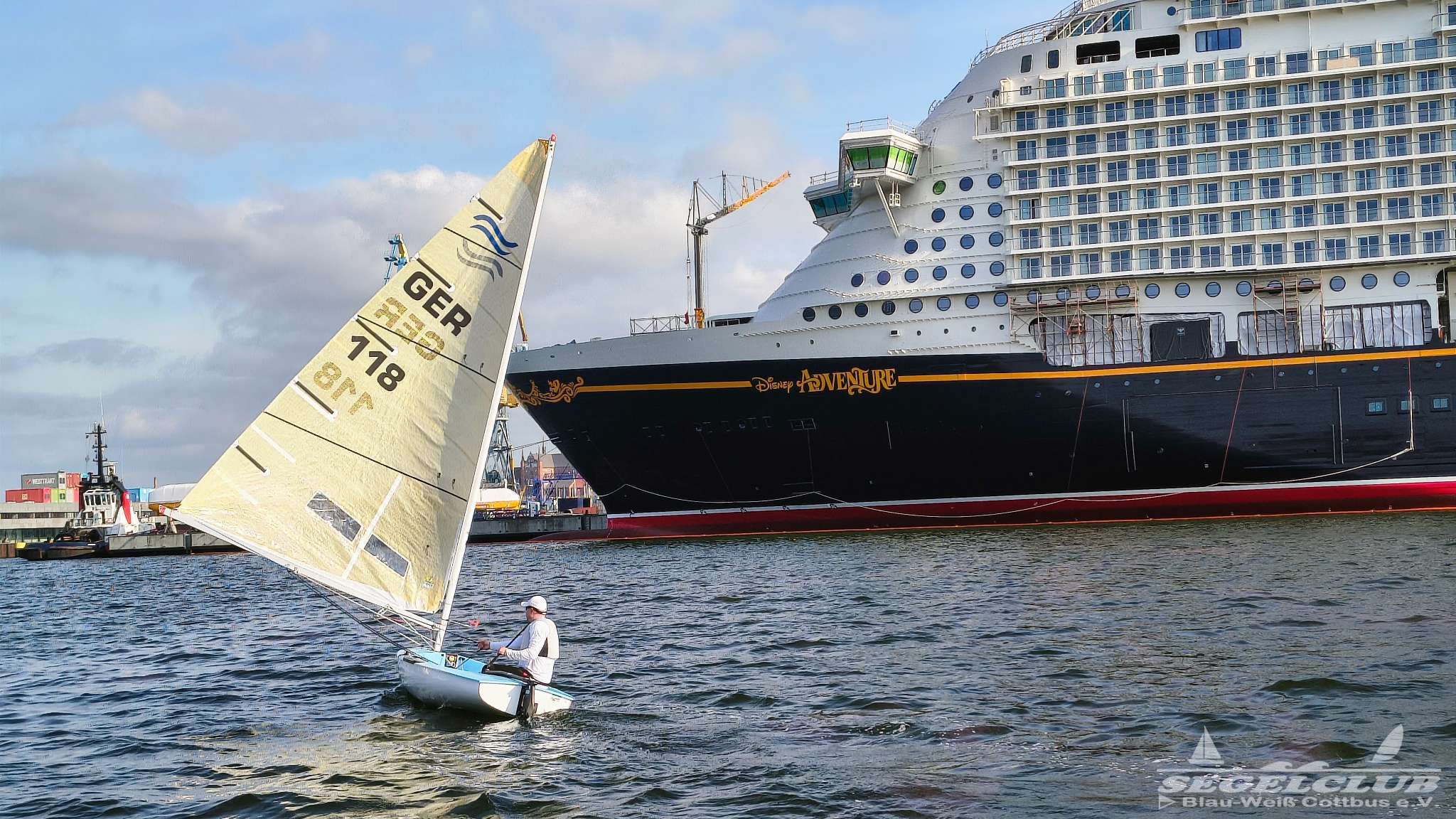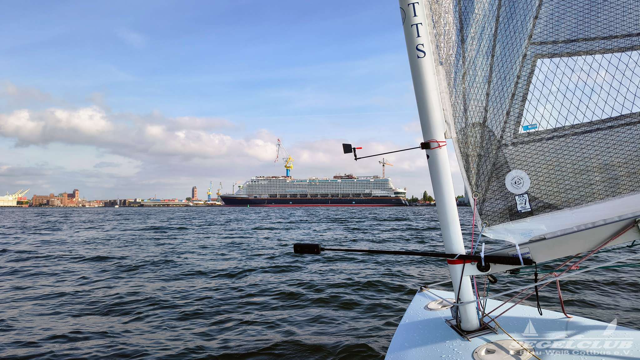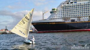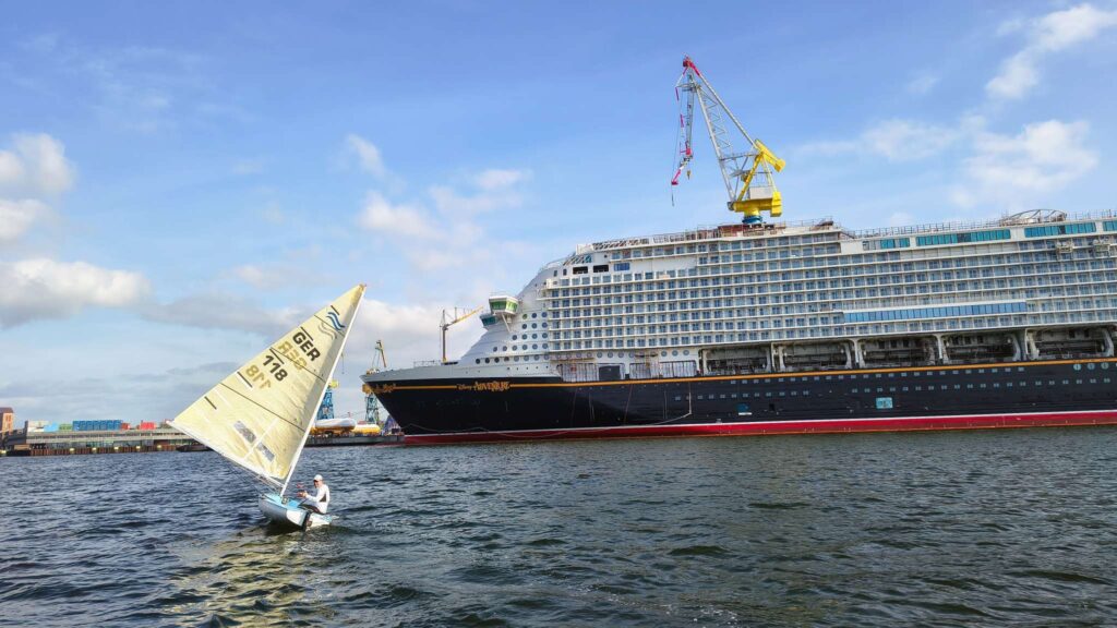 Nach den Wettfahrten am Samstag ließen Olli und ich es uns jedoch nicht nehmen, noch einen ganz besonderen Abstecher zu machen: Wir segelten direkt in den alten Hafen von Wismar. Besonders beeindruckend war der Moment, als wir bis auf etwa fünf Meter an das derzeit dort entstehende Disney-Kreuzfahrtschiff heranfahren konnten. Dieses Schiff ist schlicht gewaltig – ein echter Koloss. Im historischen Hafenbecken selbst wurde es dann ziemlich eng. Mit achterlichem Wind hinein war noch gut machbar, der Rückweg erforderte jedoch zahlreiche Kreuzschläge und etwas Geduld. Aber genau solche Manöver machen den Reiz aus.
