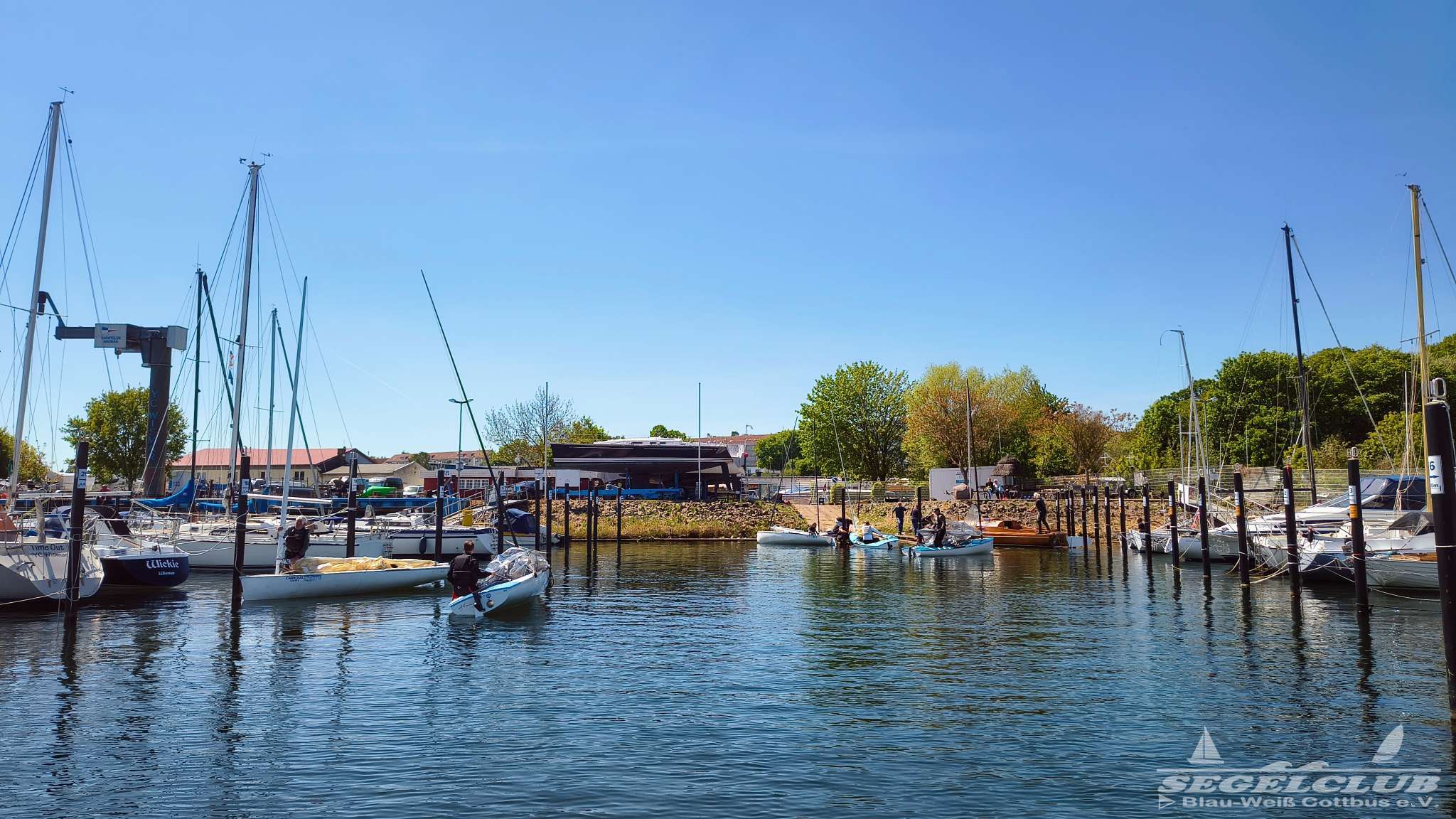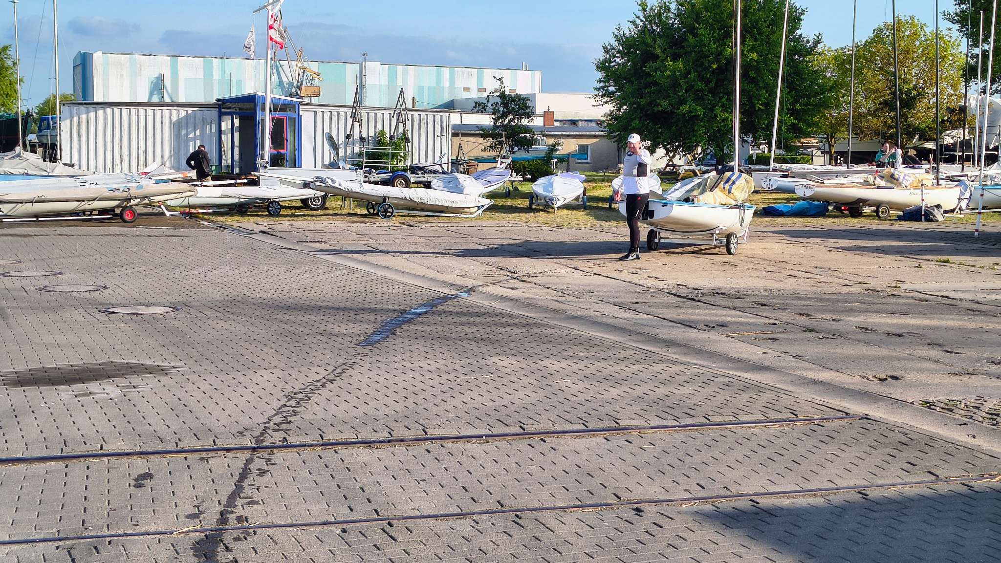 Am Freitag ging es für mich ganz kurzfristig zum Bitburg Pokal nach Wismar. Olli hatte mich überredet, doch noch mitzukommen – obwohl die Anreise alles andere als komfortabel war. Mein Boot war bereits eine Woche zuvor mit Olli vom Steinhuder Meer mitgenommen worden, nachdem wir uns dort bei einer Regatta gesehen hatten. Für mich blieb also nur die Bahn. Verspätete Züge, ein ausgefallener Anschluss und schließlich ein Bahnhof irgendwo im Nirgendwo: Am Ende musste Olli mich persönlich aus diesem „Kacknest“ einsammeln. Abenteuerliche Anreise, aber immerhin mit Happy End.