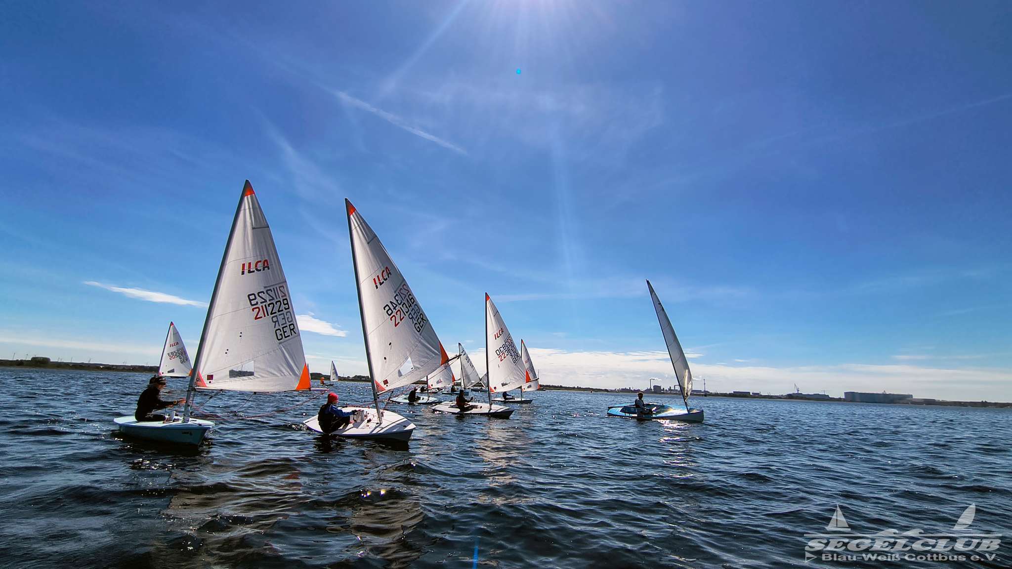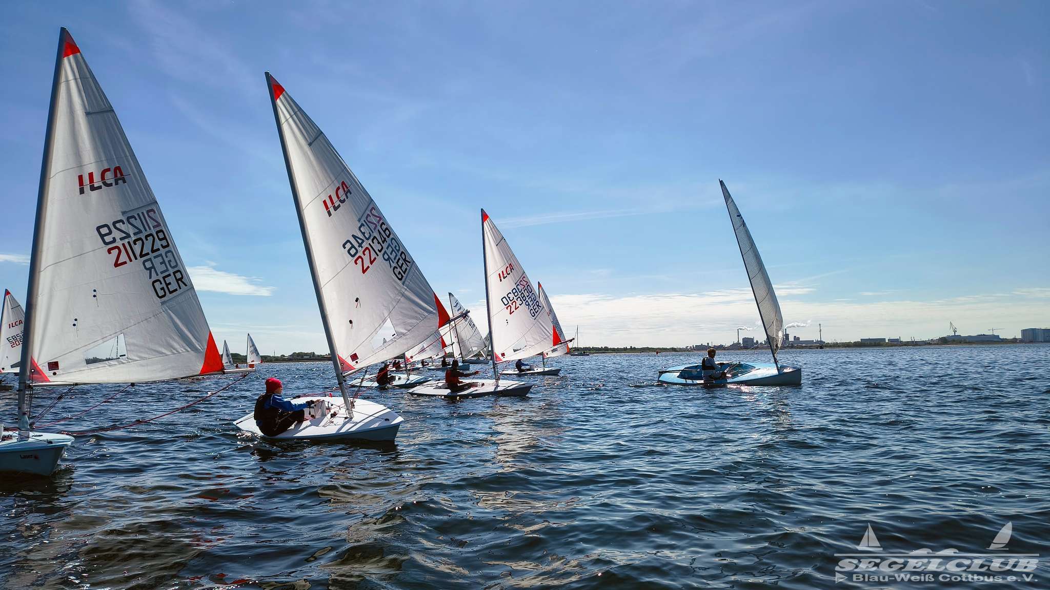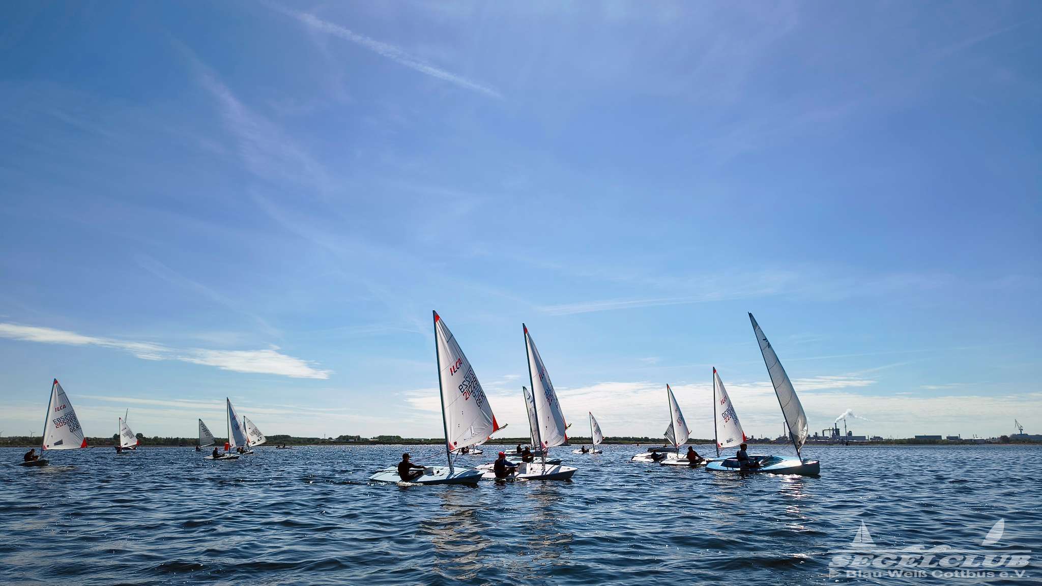 Der Samstag begann mit einer kurzen Startverschiebung, ehe ein Outerloop-Kurs mit zweimal Up-and-Down ausgelegt wurde. Die Startlinie bot genügend Platz, sodass es in keiner Wettfahrt zu Frühstarts kam. Bei leichten, aber segelbaren Bedingungen konnten zunächst zwei Läufe innerhalb der Sollzeit beendet werden. In der dritten Wettfahrt schlief der Wind dann jedoch vollständig ein, sodass diese abgebrochen werden musste. Es folgte eine längere Wartephase bei bestem Wetter, die von den ILCA-Seglern kreativ für kleine Paddelrennen genutzt wurde. Später setzte tatsächlich noch einmal genügend Wind ein, um zwei weitere Wettfahrten zu ermöglichen. Insgesamt verbrachten wir rund acht Stunden auf dem Wasser – entsprechend erschöpft war die Stimmung an Land, sowohl bei den Seglern als auch bei den Helfern.